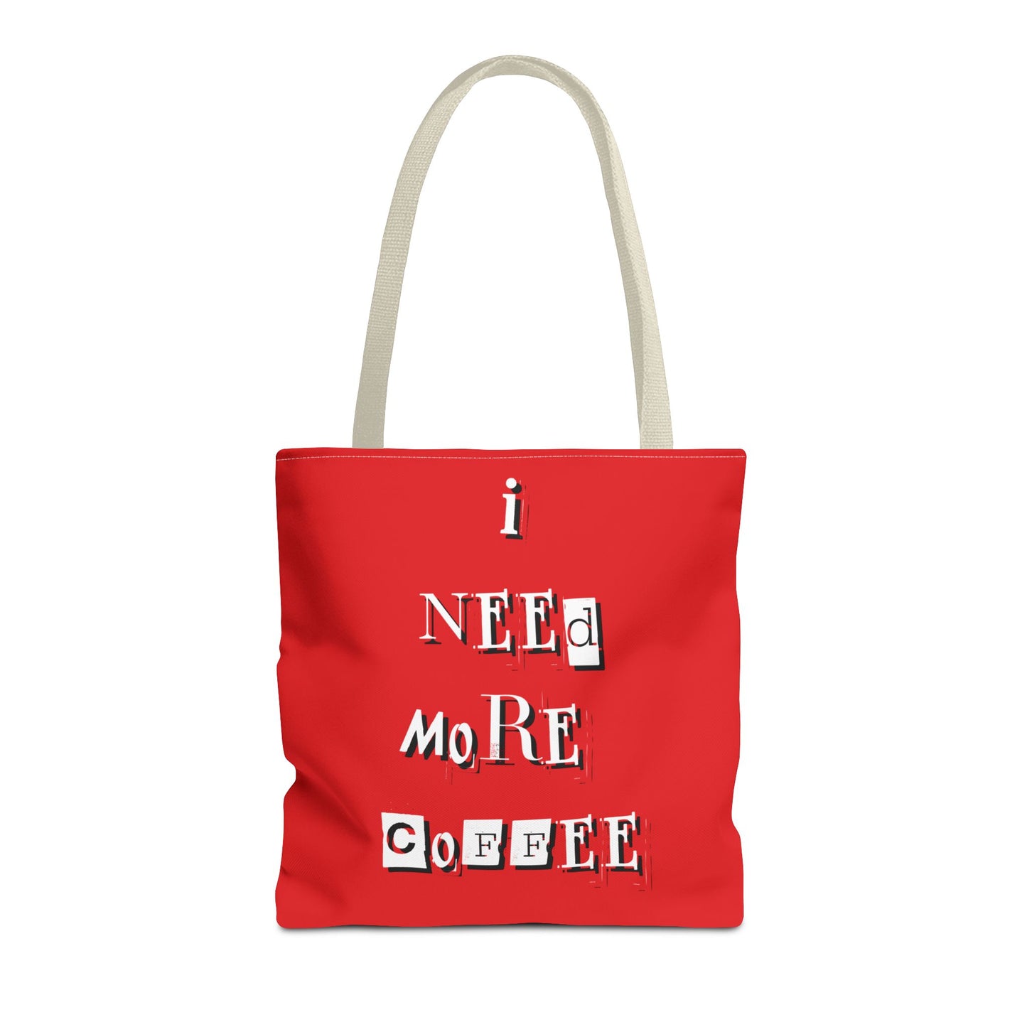 This special edition tote bag features "I need more coffee" on one side and "Mugga Argga Gogga Aorga" printed on the other side.