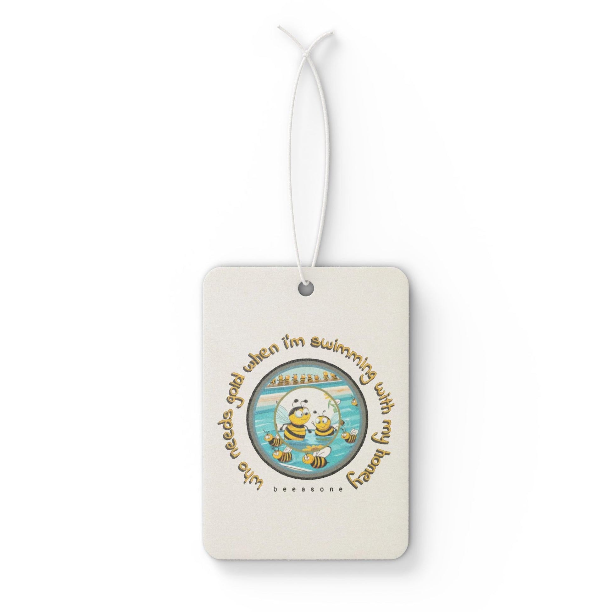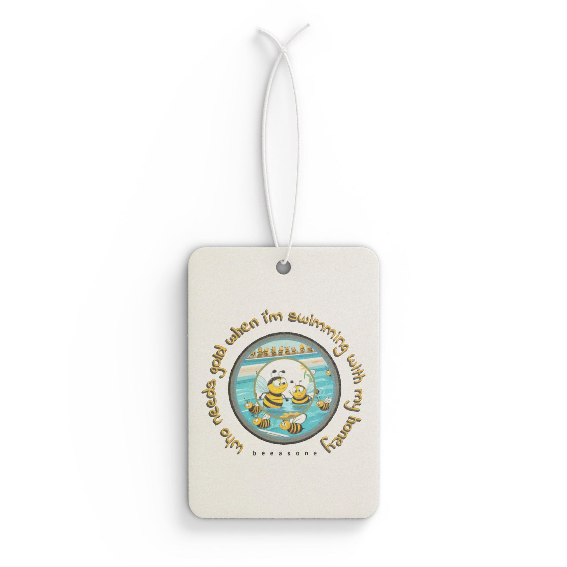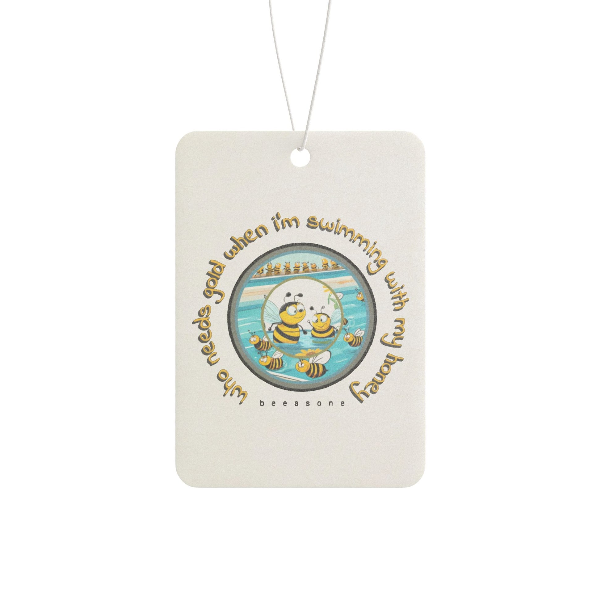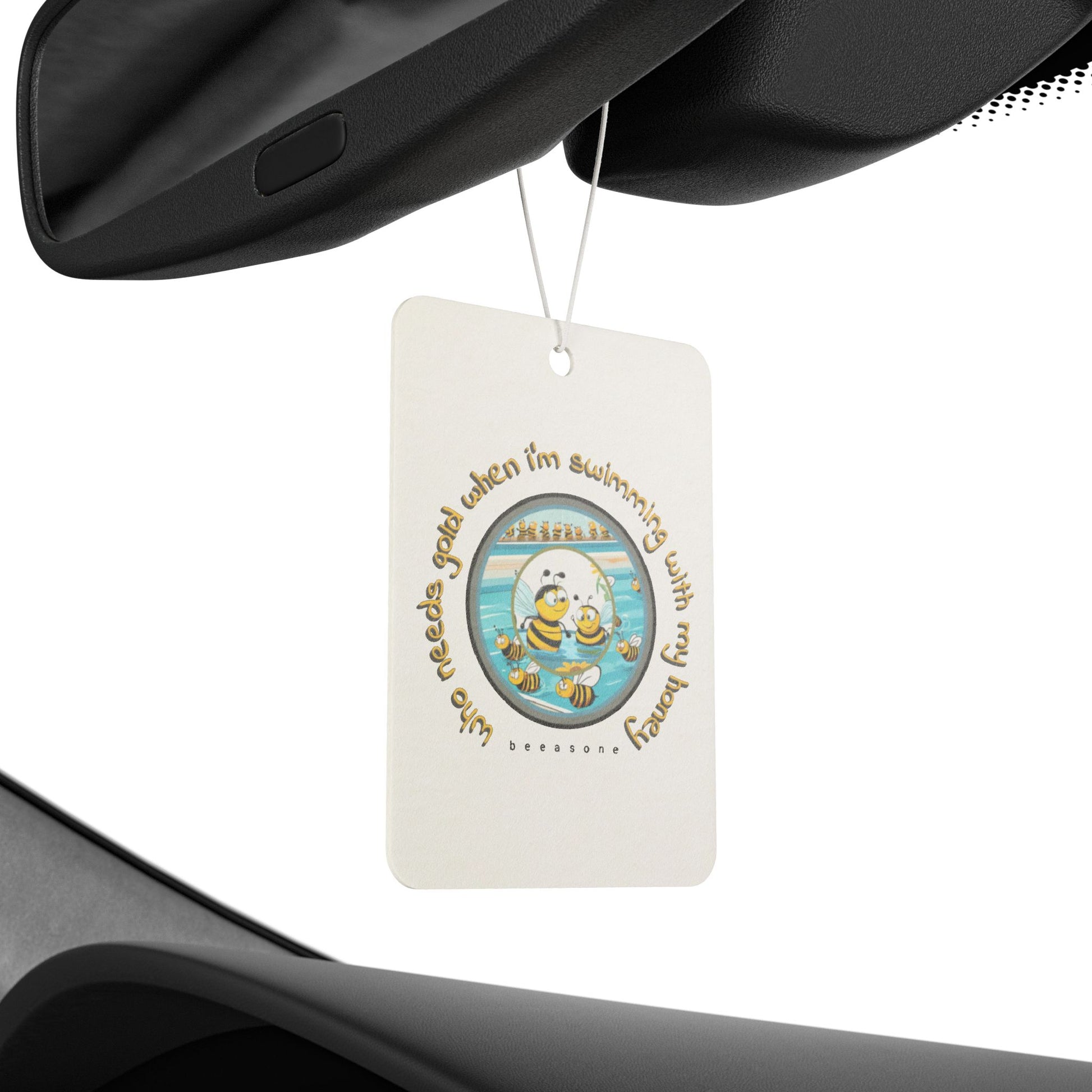 Add a touch of personality to your driving experience along with a pleasant aroma thanks to this unique car "Who needs gold when i'm swimming with my honey beeasone" air freshener. Available in three captivating scents: Pine, New Car, and Black Ice. Designed for both functionality and style, this air freshener enhances your car's interior while delivering long-lasting fragrance. Choose your favorite scent and enjoy a fresh, pleasant atmosphere on every ride.